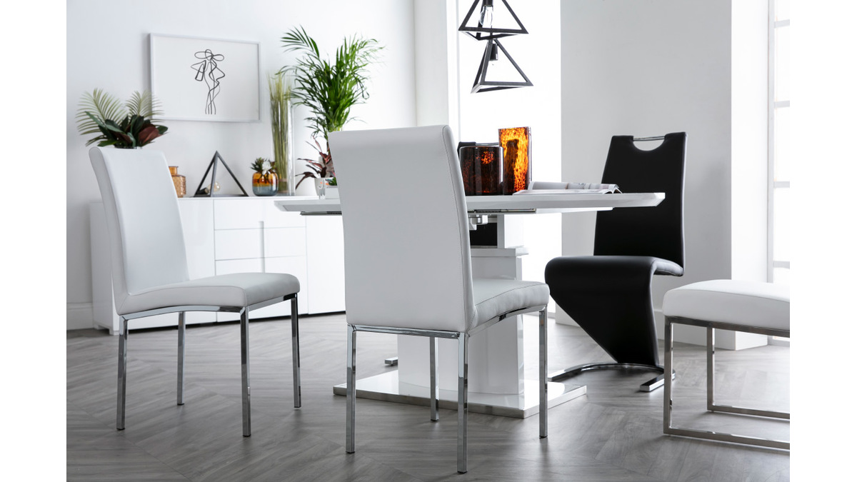 Die Design-Stühle SIMEA lassen sich einfach kombinieren und sind in Weiß, Hellgrau und Schwarz verfügbar.