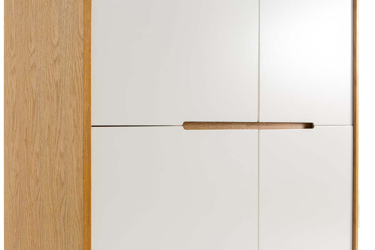 Die Beine der Design-Anrichte HELIA sind aus massiver Eiche, die Struktur aus Eichenfurnier, die Türen und Schubladen sind aus MDF mit mattem Finish, für den weichen und schlichten Look.