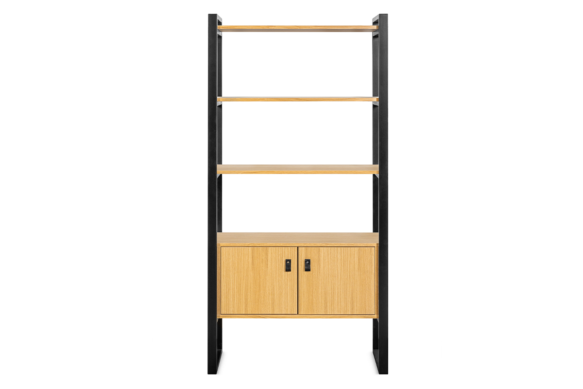 Das Bücherregal OPAL vermittelt eine raue Schönheit und ist gleichzeitig modern. Seine Linien sind klar und der Materialmix ist äußerst gelungen! Der zweitürige Korpus und die drei Fächern aus Spanplatten mit Eichenfurnier werden von einem Gestell aus schwarzem Metall eingerahmt, was diesem funktionalen Aufbewahrungsmöbel einen schönen industriellen Akzent verleiht.