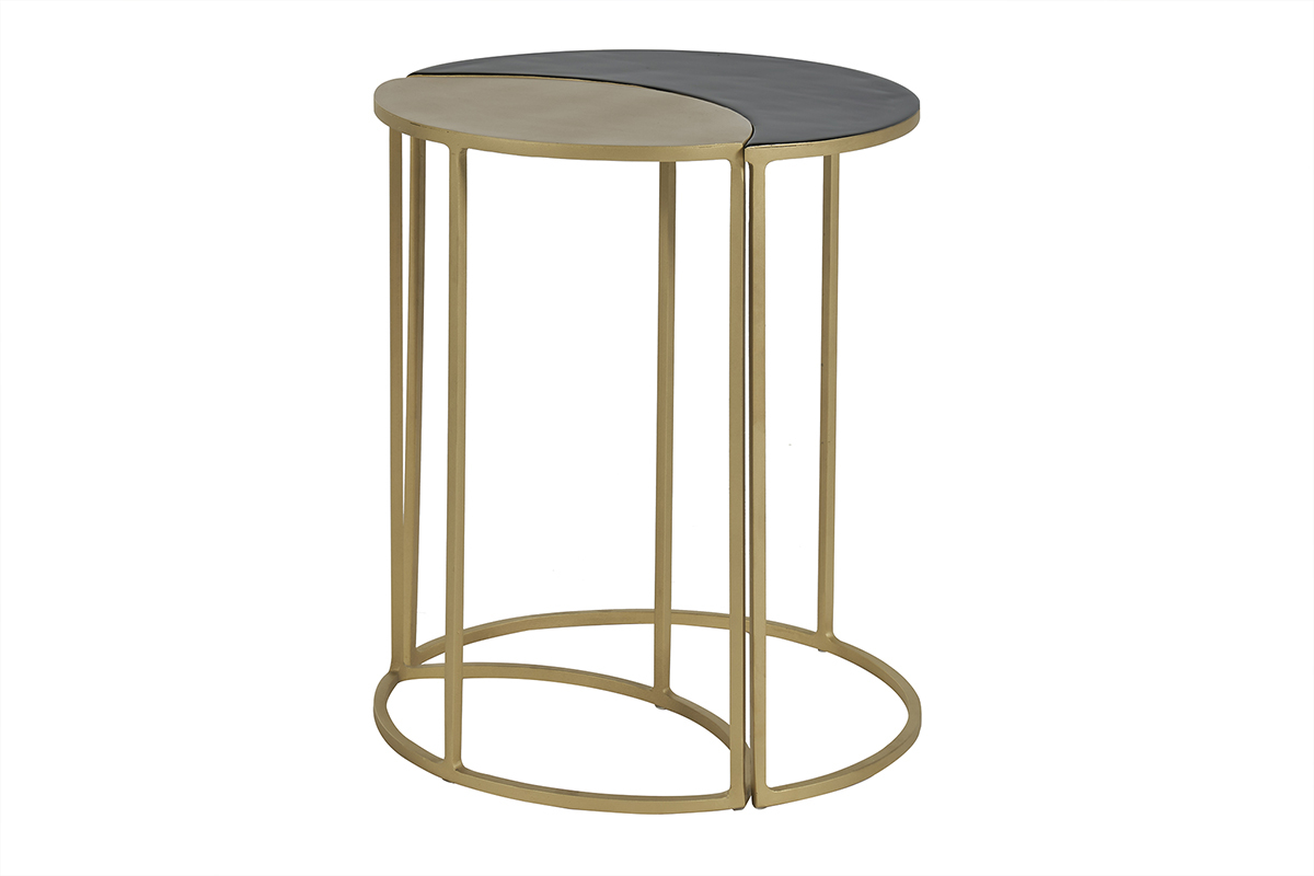 Das schlanke Gestell aus goldfarben lackiertem Metall zeichnet zarte grafische Linien in Ihrem Interieur. Es harmoniert hervorragend mit den schmalen Tabletts (1 cm dick) aus vergoldetem und schwarz lackiertem Metall. So ergibt sich eine einzigartige, zarte Silhouette, die sich nahtlos in jede Inneneinrichtung einfügt.
