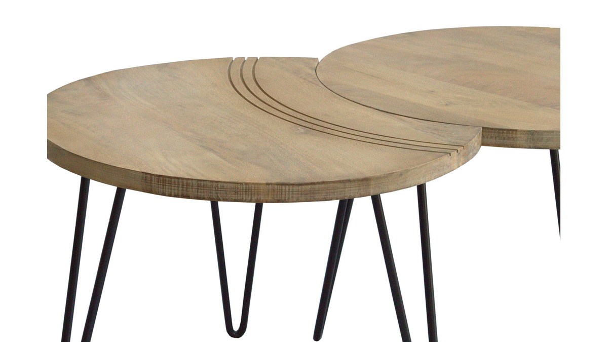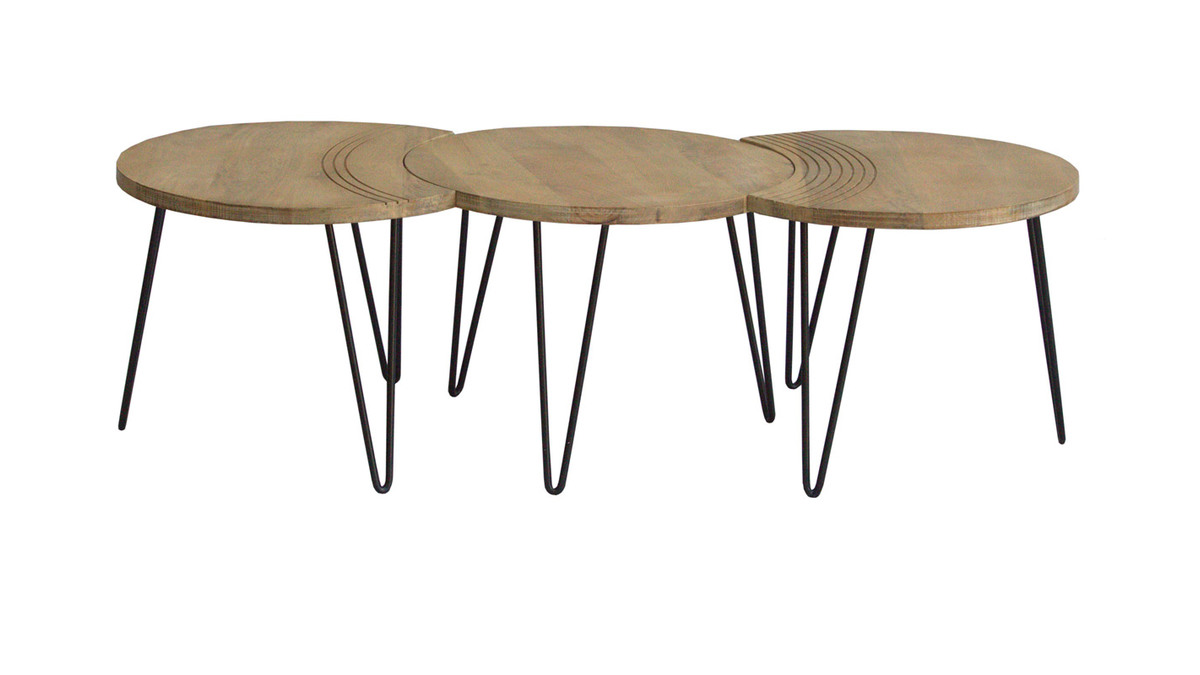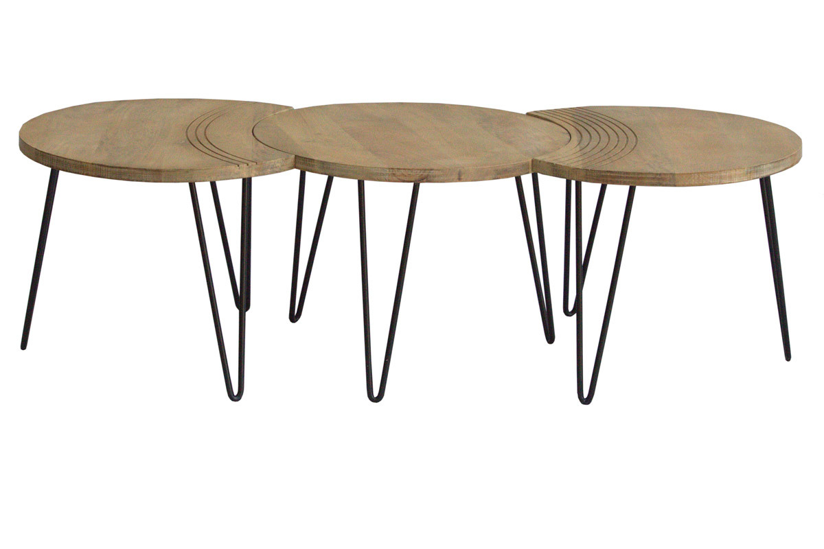 Zwei der Tische haben eine geschwungene Seite, die an einen sichelförmigen Mond erinnert, und sind mit hübschen Kreisbögenstrukturiert, um ihre Form zur Geltung zu bringen. Der dritte Tisch ist komplett rund und hat einen Durchmesser von 60 cm. Stellen Sie sich Ihr Wohnzimmer nach Ihren Wünschen zusammen, indem Sie die 3 Tische kombinieren, oder nur zwei, um den dritten als Beistelltisch in einer Ecke des Raumes zu platzieren. Alles ist möglich, um einen tollen Look zu erzielen.
