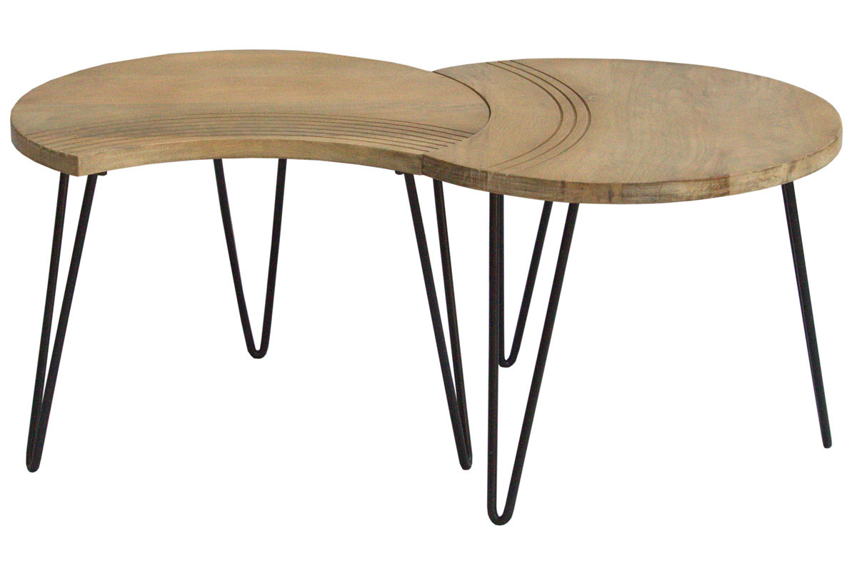 Die VIBES-Tische bestehen aus einer Platte aus Mangoholz und einem Hairpin-Untergestell aus schwarzem Metall und sind ein Synonym für Authentizität. Sie verleihen Ihrem Interieur eine originelle natürliche und industrielle Note.
