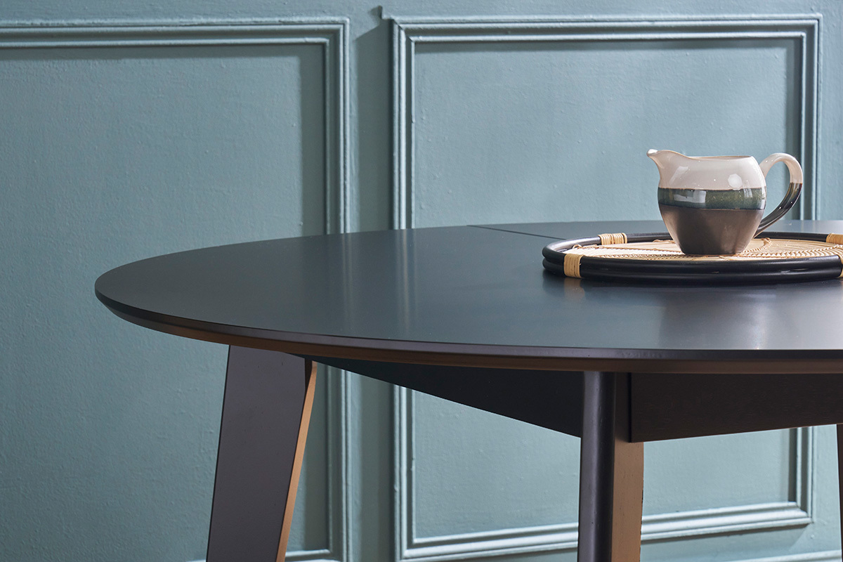 Mit einem ursprünglichen Durchmesser von 120 cm lässt sich der Tisch LEENA um 30 cm verlängern, was ihn in einem ovalen Tisch mit Platz für 6 Personen verwandelt.