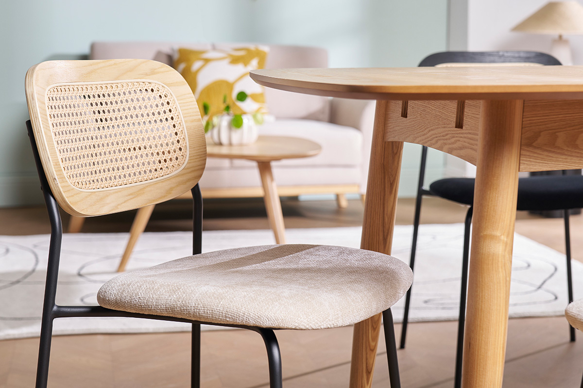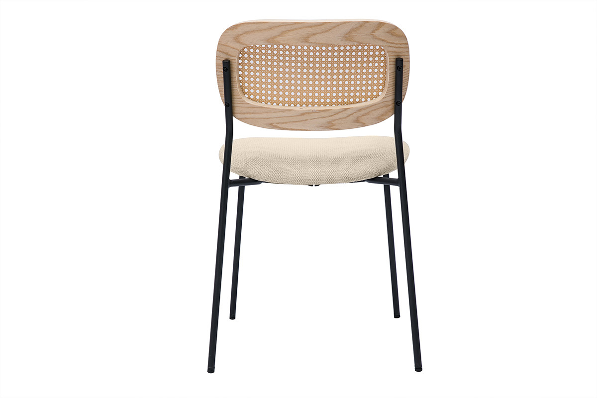 Die Stühle MIRANDA mit ihrem gepflegten Design und den Sitzflächen aus beigem strukturiertem Samteffektstoff verkörpern Eleganz und Komfort, um jeden Wohnraum zu verschönern. Ideal für das Esszimmer, kombinieren sie zeitgenössischen Stil und natürliche Inspirationen und schaffen eine warme und einladende Atmosphäre. Die Rückenlehne aus Rattanwebung verleiht einen handwerklichen und authentischen Touch, der moderne Trends widerspiegelt und einen Hauch von Retro-Chic bringt. Diese einzigartige Materialkombination macht sie zur idealen Wahl für Innenräume, die auf der Suche nach Originalität und Charakter sind.
