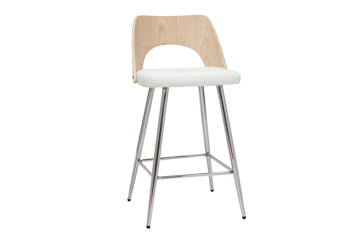 Diese Barhocker (H66.5 cm) sind sowohl minimalistisch und authentisch als auch funktional und elegant. Sie vereinen Farben und Materialien auf äußerst harmonische Weise und erzielen so ein höchstes Maß an Design. Die moderne Silhouette und die skandinavisch inspirierten Details sind ein wahrer Blickfang und werden Ihre Küche oder Ihr Esszimmer aufwerten. Der weiße Bezug aus Polyurethan und die verchromte Metallbeine wirken sehr modern, während die Rückenlehne aus Eichenfurnier dem Gesamtbild eine weichere Note verleiht. Das helle Holz verleiht Ihrer Einrichtung einen warmen Touch, und Ihre Essecke wird dadurch noch stilvoller!
