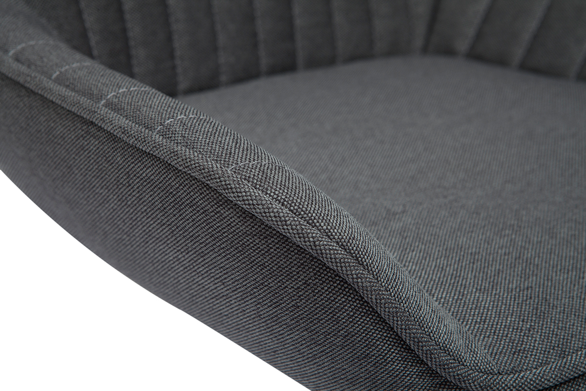 Die Barhocker RONNIE garantieren äußerst viel Komfort im Alltag. Mit ihrer umhüllenden Rückenlehne (B45 x H28,5 cm), den nach außen geneigten Armlehnen und ihrer weichen Polsterung (Sitzdichte 30 kg/m3) laden diese hohen Barhocker zu geselligem Beisammensein und freudvollen Stunden ein. Sie sind mit einem geschmeidigen und anthrazitgrauen Stoff (100 % Polyester) bezogen, der sich weich anfühlt und über einen raffinierten, gesteppten Effekt verfügt. Der robuste schwarze Metallfuß mit integrierter Fußstütze bietet eine hohe Stabilität und verleiht gleichzeitig einen sehr zeitgemäßen Charakter.
