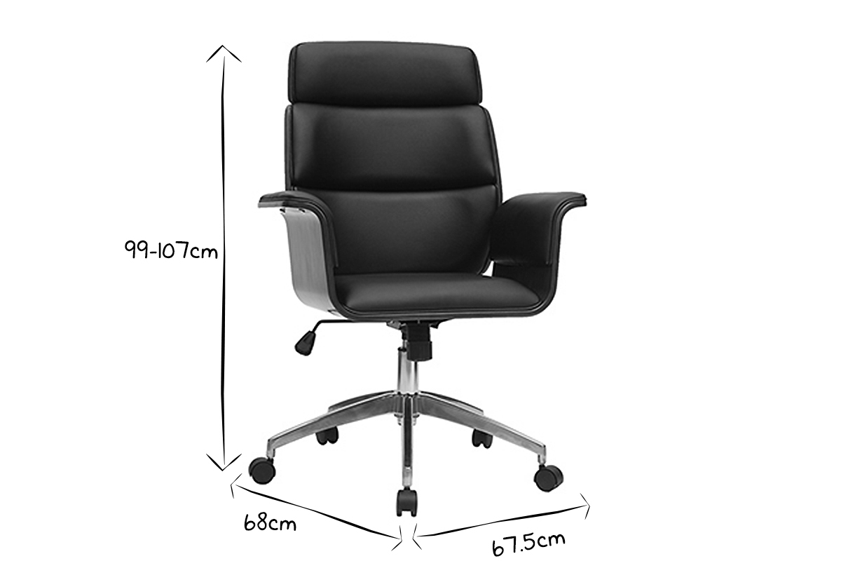 Eine Struktur in Nussbaum-Finish, ein kontrastierender Sitz aus schwarzem Polyurethan, geschwungene Linien... dieser Bürostuhl hat alle Qualitäten eines trendigen Sitzes. Die gebogenen Armlehnen und die gepolsterte Rückenlehne werden wegen ihres einzigartigen Stils besonders geschätzt.