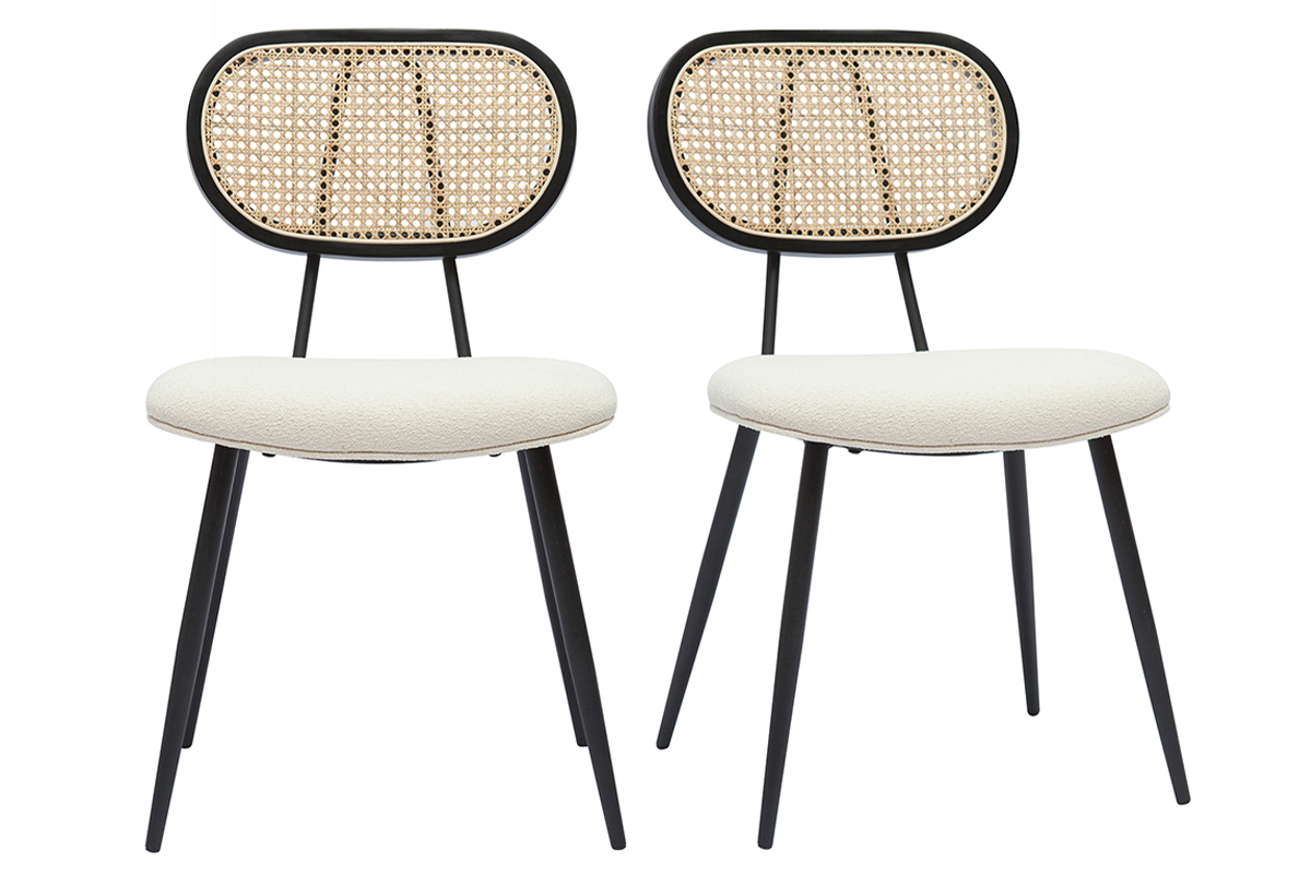 Sie möchten Funktionalität und Schönheit miteinander verbinden? Diesen bequemen und sehr ästhetischen Stühle gelingt diese harmonische Verbindung! Als eine brillante Neuinterpretation des Thonet-Stuhls bietet Ihnen TOLMA ein bisschen Boho, ein bisschen Seventies und ein raffiniertes Design. Besonders sind vor allem die wohldurchdachten Linien! Das Rohrgeflecht der abgerundeten Rückenlehne besticht durch schwarz lackiertes Holz. Die breite und einladende Sitzfläche ist mit einem angenehmen Schaumstoff (Dichte 28-20 kg/m³) gepolstert. Die Kompassfüße aus schwarzem Metall kombinieren Retro-Elemente mit zeitgenössischem Design. Das Ergebnis? Ein erfrischendes und eklektisches Ensemble, welches durch die mit einem weißen Stoff mit Wolleffekt bezogene Sitzfläche abgerundet wird!