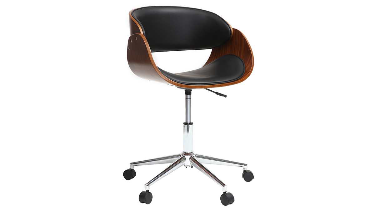Dieser moderne Drehstuhl BENT hat ein extrem stylisches Aussehen! Sein Sitz und seine Rückenlehne aus schwarzem, sehr pflegeleichten Polyurethan stehen in einem wunderschönen Kontrast zu seiner Struktur aus Formholz mit einem Finish aus Nussbaum und verleihen ihm einen sehr trendigen Vintage-Look.