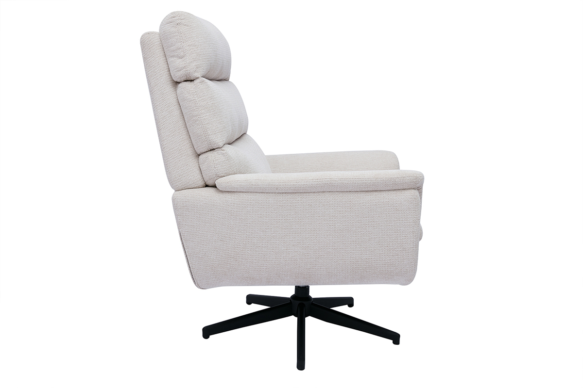 Dieser beige Stuhl ruht auf einem drehbaren 360°-Sockel aus mattem schwarzem Metall, der Robustheit und Stabilität gewährleistet und gleichzeitig eine fließende Drehung ermöglicht. Dieses funktionale Detail macht ihn ideal für eine Leseecke, einen Entspannungsbereich oder sogar ein Büro, wo er sich leicht den Bewegungen und Bedürfnissen des Benutzers anpasst.