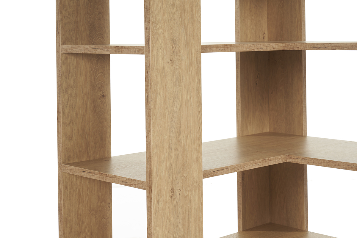 Einfache Linien, schlichte Eleganz, grafisches Volumen: Dieses Eckregal in hellem Holz in Eiche kombiniert gekonnt Stil und Funktionalität. Sanft und poetisch: Das helle Holz verleiht zeitgemäßen Interieurs eine warme Note. Leicht passt dieses skandinavische Eckregal in ein nordisches Ambiente, aber auch in einem zeitgenössischen oder vom trendigen ?Landhaus-Chic? inspirierten Dekor findet es seinen Platz und wird dem Interieur eine natürliche Note verleihen. Alles in allem erweist sich dieses moderne Bücherregal in heller Eiche als hübsches, offenes Aufbewahrungsmöbel, das zeitlos ist und nie aus der Mode kommen wird. So können Sie stilvoll Ihren Wohnbereich einrichten!
