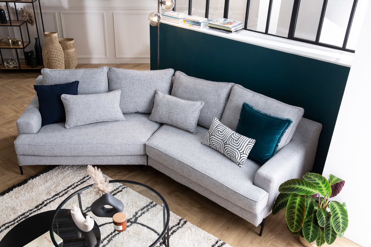 Die Originalität dieses Sofas liegt in seinem Eckwinkel, der um 136° geöffnet ist. Diese originelle Form macht es zu einer sehr geselligen Sitzgelegenheit, auf der leicht 5 Personen Platz finden. Das Modell PUCHKINE verbindet die großzügigen Abmessungen mit einer bequemen Sitzfläche und einem zeitgenössischen Design, in dem man das gesamte französische Know-how wiederfindet.