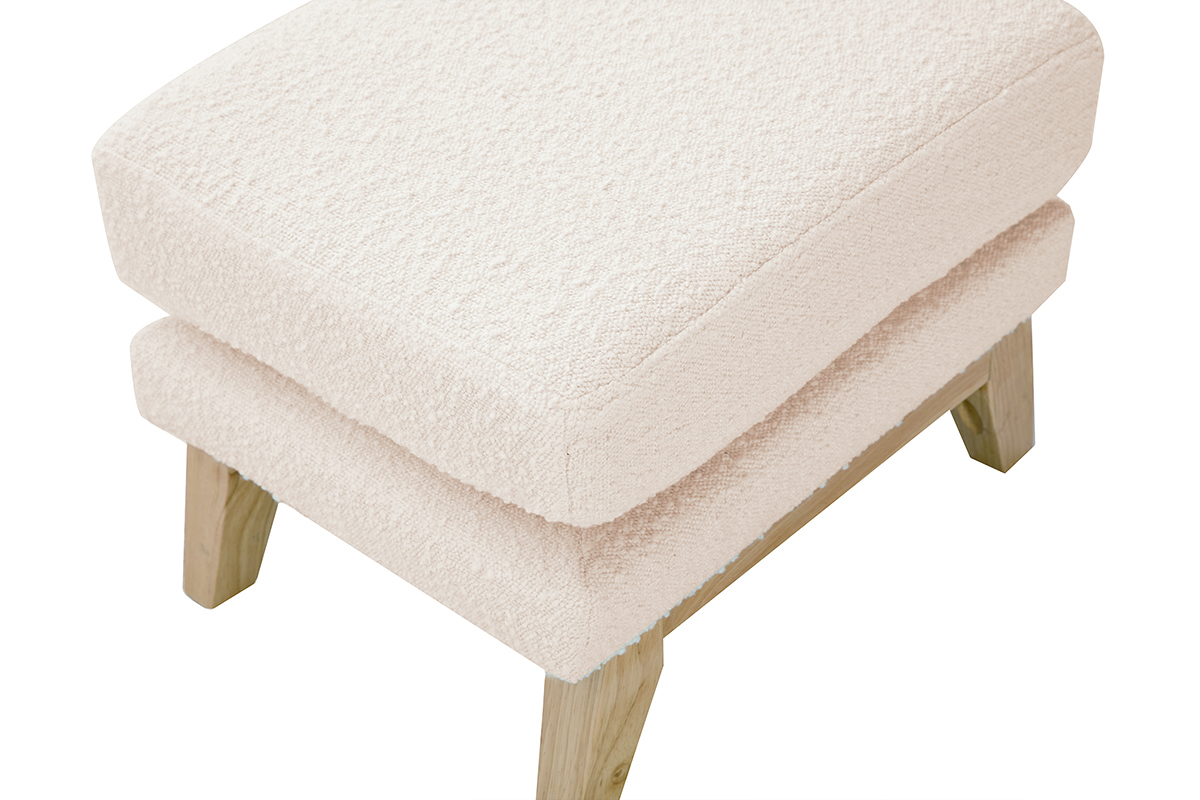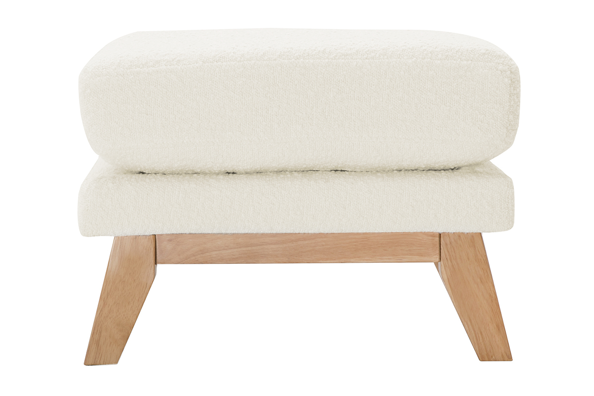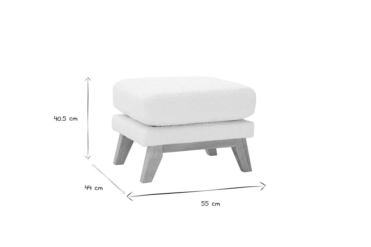 Die weiche Sitzfläche mit einem weißen Bezug mit Bouclé-Wolleffekt, ist angenehmen gepolstert. Als zusätzliche Sitzmöglichkeit verleiht er Ihrem Wohn- oder Schlafzimmer eine originelle Note. Als Fußstütze passt dieses kleine Designmöbel harmonisch zu Ihrem Sofa oder Sessel.