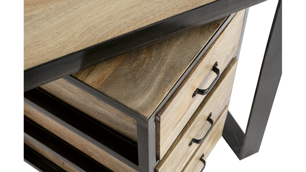 Was die ganze Schönheit dieses Möbels ausmacht, sind diehandwerklich bearbeiteten Materialien. Platte und Schubladen bestehen ausmassivem Mangoholz, eine exotische Holzsorte mit attraktiven Äderungen. Dazu passt das solide Gestell aus handbehauenem Stahl. Diese rohen, warmen und naturnahen Materialien bringen einen entschieden trendigen Charakter in die Einrichtung.