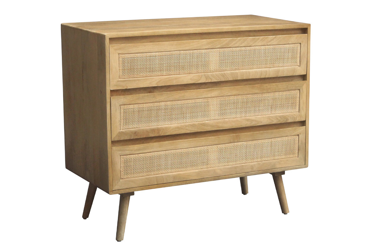 Ein Balanceakt fernab von allem Überflüssigen ? diese Kommode mit 3 Schubladen aus Holz und Rattangeflecht steht für klassische Linien und minimalistisches Volumen. Eine Einfachheit, die sich auch in der Wahl der Materialien ausdrückt. Das Rattangeflecht kommt in unseren Innenräumen wieder in Mode und verkleidet die Schubladenfronten auf ganz besondere Weise. Es passt wunderbar zum Korpus aus massivem Mangoholz, einer exotischen Holzart, deren blonder Schimmer das Ambiente erwärmt. Diese dekorative Kommode aus Massivholz erfüllt Ihren Wunsch nach Natürlichkeit und Authentizität.