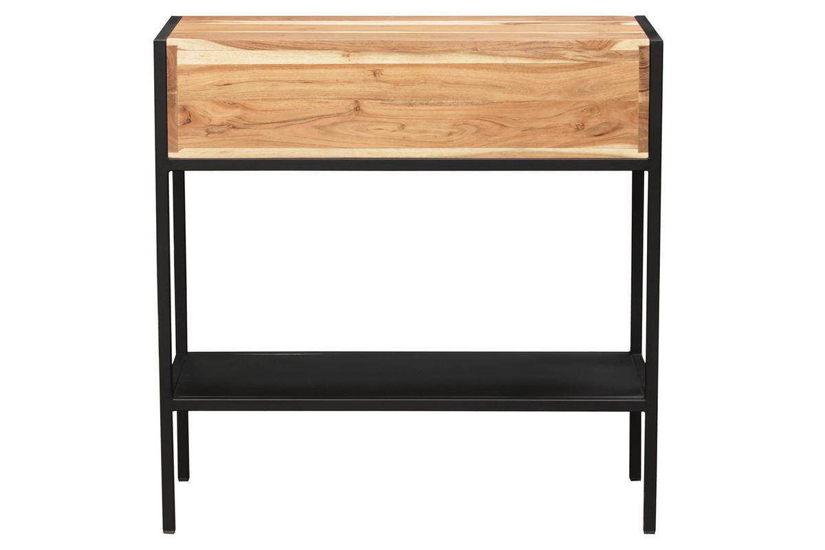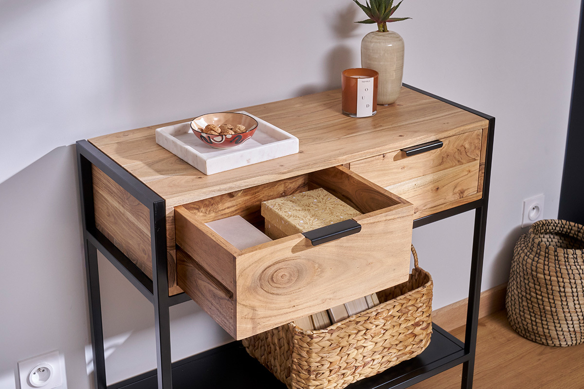 Diese hübsche Konsole von Caroline Marliac, Miliboo-Designerin, besteht aus einemluftigen und grafischen Aufbau aus schwarzem Metall, der ihrAblageelement aus massiver Akazie schön zur Geltung kommen lässt. Akazienholz ist eine robuste Holzsorte, das insbesondere für seine warmen, prononcierten Töne gepriesen wird, die wunderbar mit dem schwarzen Metallfinish harmonieren.