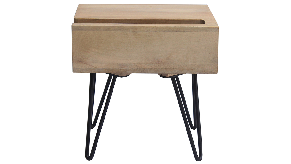 Seine Abmessungen (B45 x T40 cm) machen ihn zu einem idealen Möbelstück, um ein kleines Schlafzimmer zu organisieren. Wenn dieser Nachttisch ein funktionelles Möbelstück ist, fehlt es ihm auch nicht an Charme. Es wird in Handarbeit aus Mangoholz und Schwarzmetall hergestellt. Diese Holzart hat verschiedene Details und Schattierungen, die ein einzigartiges authentisches Aussehen bieten. Der Metallstiftfuß bringt Stärke, Stabilität und Leichtigkeit in diesen Massivholz-Nachttisch.
