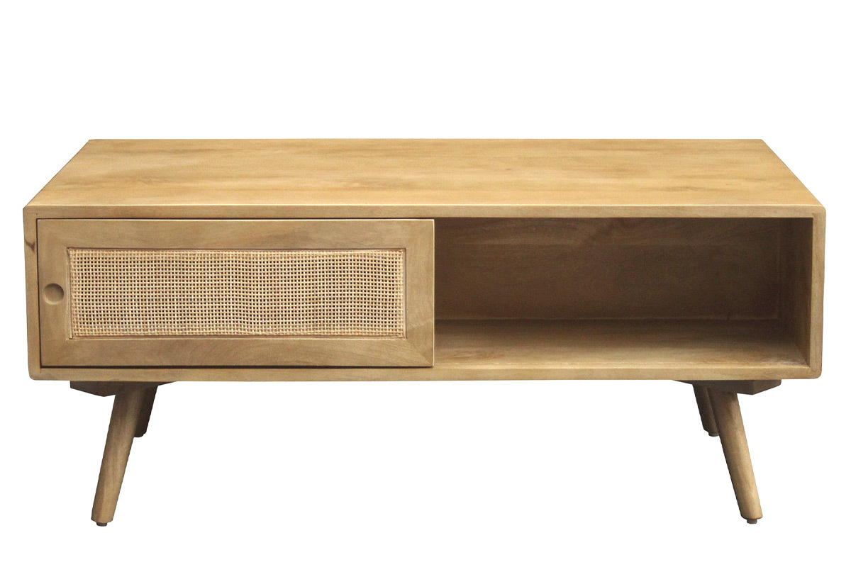 Dieser rechteckige Couchtisch aus Holz und Rohrgeflecht wird zum Mittelpunkt für Freunde und Familie und das mitten im hektischen Alltag. Erfolgreich wird der Korpus aus massivem Mangoholz (eine exotische Holzart) mit Rattangeflecht kombiniert.