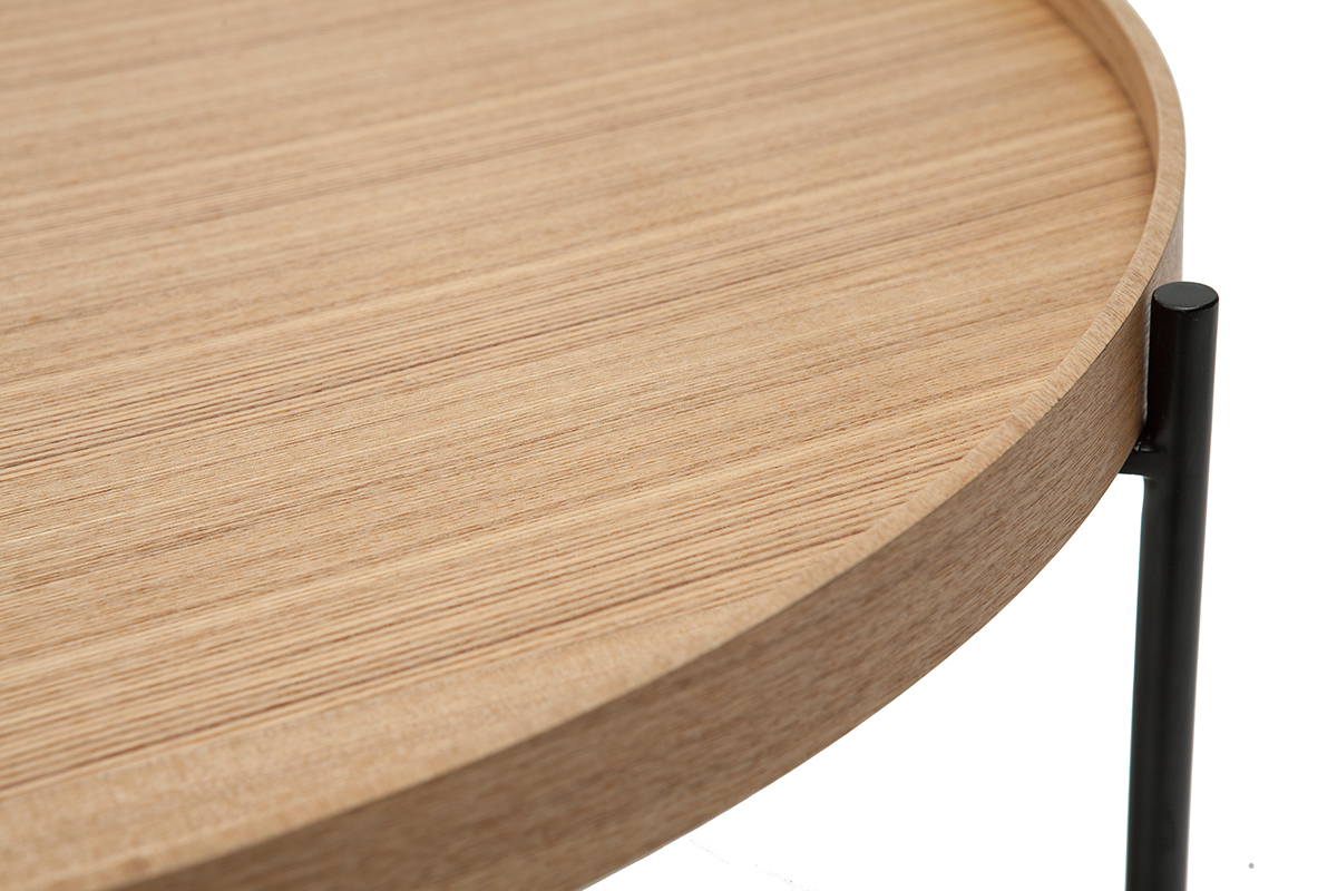 Der Couchtisch BASSY ist eine harmonische Kombination aus Holz und Metall. Die Materialien wurden mit Finesse verarbeitet und die Proportionen sind perfekt durchdacht. Die große Tischplatte (D 75cm) aus MDF mit Eschenfurnier wird von einem feingliedrigen Korpus aus schwarzem Metall getragen. Die Zartheit der Struktur tut der Stabilität des Ensembles keinen Abbruch. Der erhöhte Rand der Tischplatte (1,5 cm) trägt nicht nur zur Ästhetik bei, sondern verhindert auch, dass Gegenstände herunterfallen. Wir mögen insbesondere die Wärme, die das Holz ausstrahlt sowie die hübschen Maserungen, die für eine charakterstarke Optik sorgen.