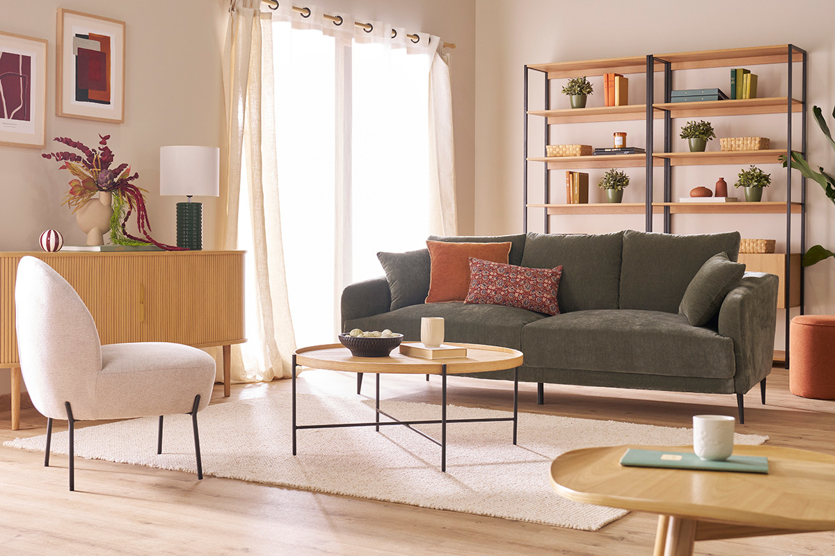 Der Couchtisch BASSY ist eine harmonische Kombination aus Holz und Metall. Die Materialien wurden mit Finesse verarbeitet und die Proportionen sind perfekt durchdacht. Die große Tischplatte (D90 cm) aus MDF mit Eschenfurnier wird von einem feingliedrigen Korpus aus schwarzem Metall getragen. Die Zartheit der Struktur tut der Stabilität des Ensembles keinen Abbruch. Der erhöhte Rand der Tischplatte (1,5 cm) trägt nicht nur zur Ästhetik bei, sondern verhindert auch, dass Gegenstände herunterfallen. Wir mögen insbesondere die Wärme, die das Holz ausstrahlt sowie die hübschen Maserungen, die für eine charakterstarke Optik sorgen.