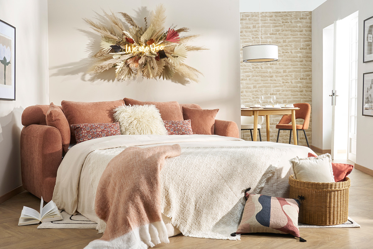 Optimieren Sie Ihre Einrichtung! Kombinieren Sie das terracottafarbene Schlafsofa SACHA mit einem passenden Couchtisch ? schaffen Sie sich ein trendiges Wohnzimmer!