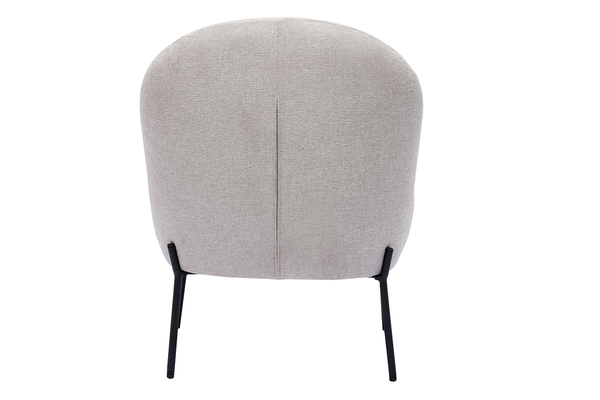 Die Rückenlehne und Sitzfläche sind mit einem angenehmen Schaumstoff gepolstert und schaffen einen einladenden und bequemen Sitz, der an einen gemütlichen Kokon erinnert. Das Ensemble ist mit einem beigefarbenen, strukturierten Stoff in Veloursoptik bezogen, der einen eleganten Kontrast zu dem luftigen schwarzen Metallgestell bildet. Dieser einladende Sessel lädt zu endlosem Entspannen ein!