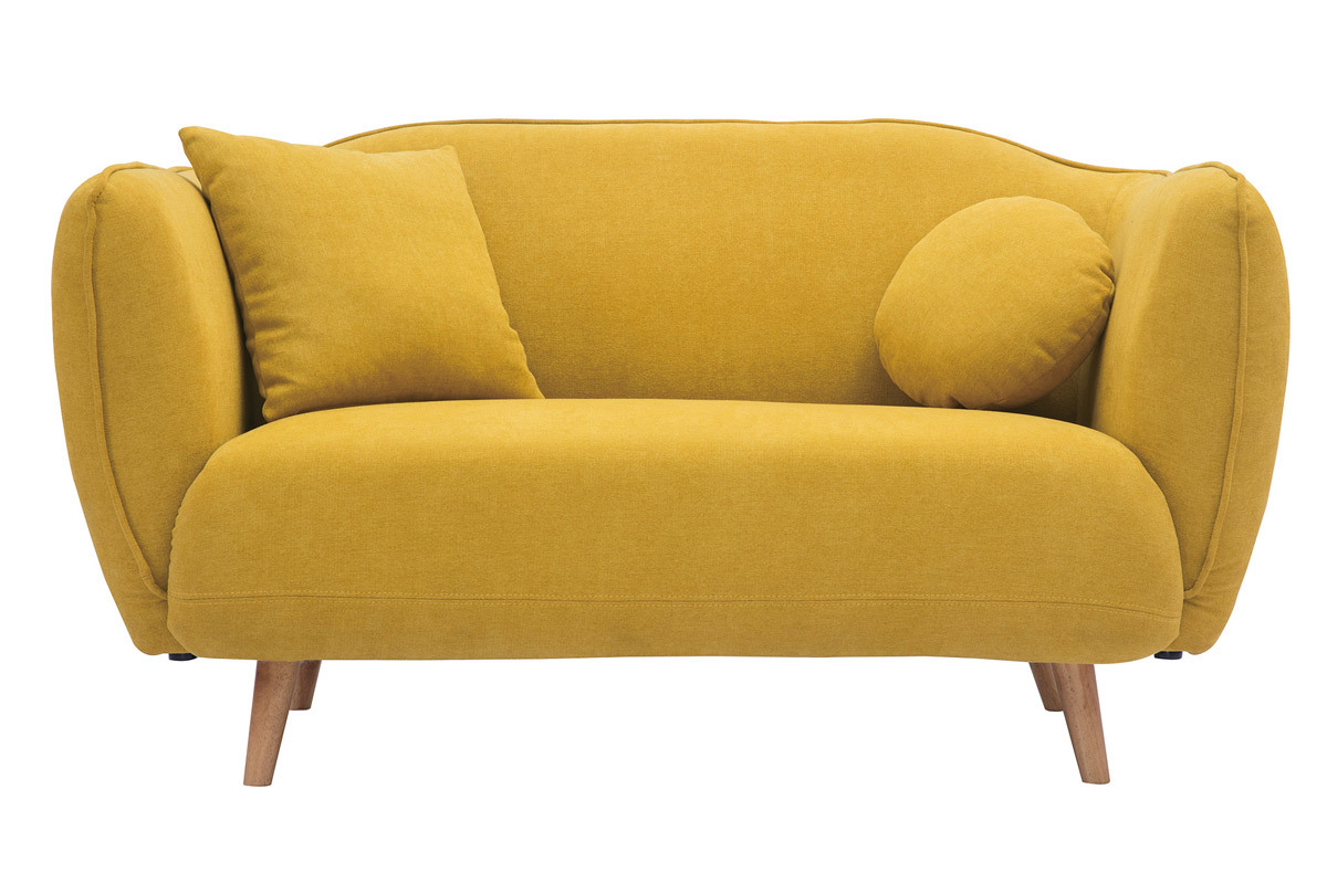 Das Zweisitzer-Sofa verwandelt dank seiner organischen Ästhetik einfache Interieurs in einen gemütlichen Rückzugsort. Die großzügige Sitzfläche (B100 x T53 cm), die weichen Kissen und die angenehme Polsterung (Schaumdichte 24kg/m3) laden zu einem einzigartigen Erlebnis puren Komforts ein. Der sanfte Bezug wird Sie überwältigen, der leuchtend senfgelbe Stoff mit Samt-Effekt hält was er verspricht (90 % Polyester und 10 % Acryl).