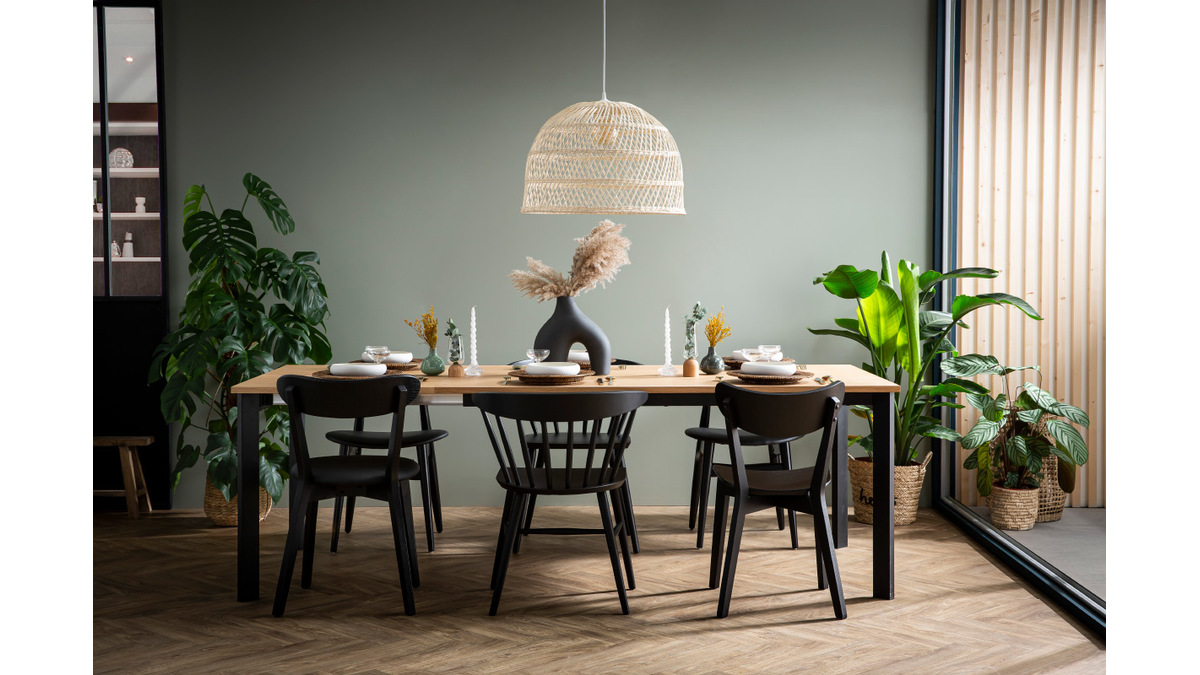 Das Design dieser Esszimmerstühle erinnert an skandinavische Sitzmöbel. Die geschwungenen Linien, das Eichenfurnier, der Minimalismus ihrer Form... so viele charakteristische Elemente der nordischen Möbel. Dieser Scandi-Spirit wurde mit einem eleganten und modernen Schwarzton kombiniert. Dank dieser monochromen Verkleidung lassen sie sich leicht in Ihr Interieur integrieren. Um einen hölzernen Esstisch herum werden sie jene warme und freundliche Atmosphäre schaffen, die für Essbereiche gesucht wird. Sie können mit passenden Stühlen aus Metall, hellem oder farbigem Holz für ein trendiges Esszimmer kombiniert werden.