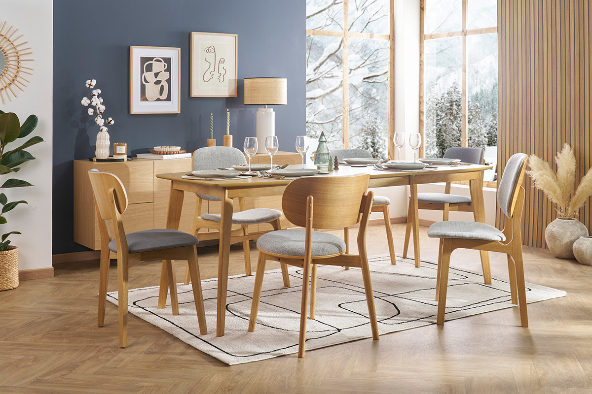 Für einen zarten und raffinierten Essbereich können Sie die Stühle FAUVETTE mit einem skandinavisch inspirierten Esstisch mit weichen Linien und einem Touch Retro kombinieren.