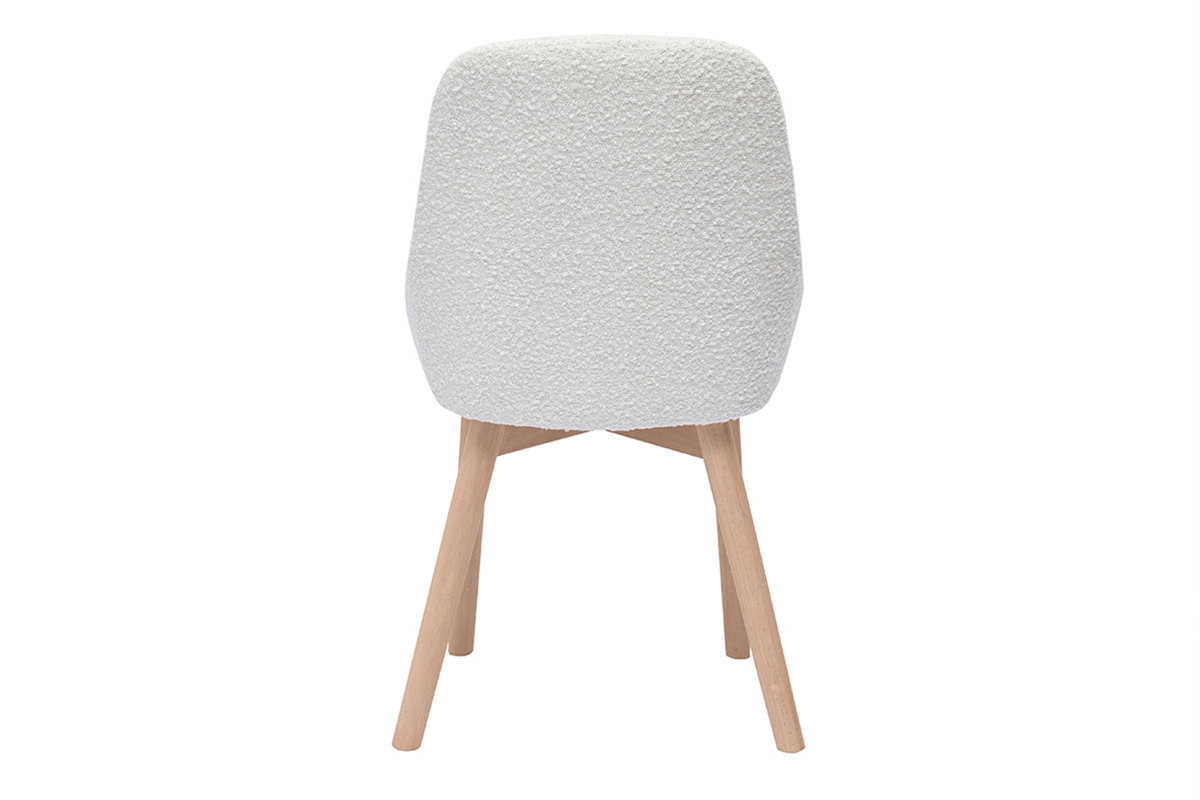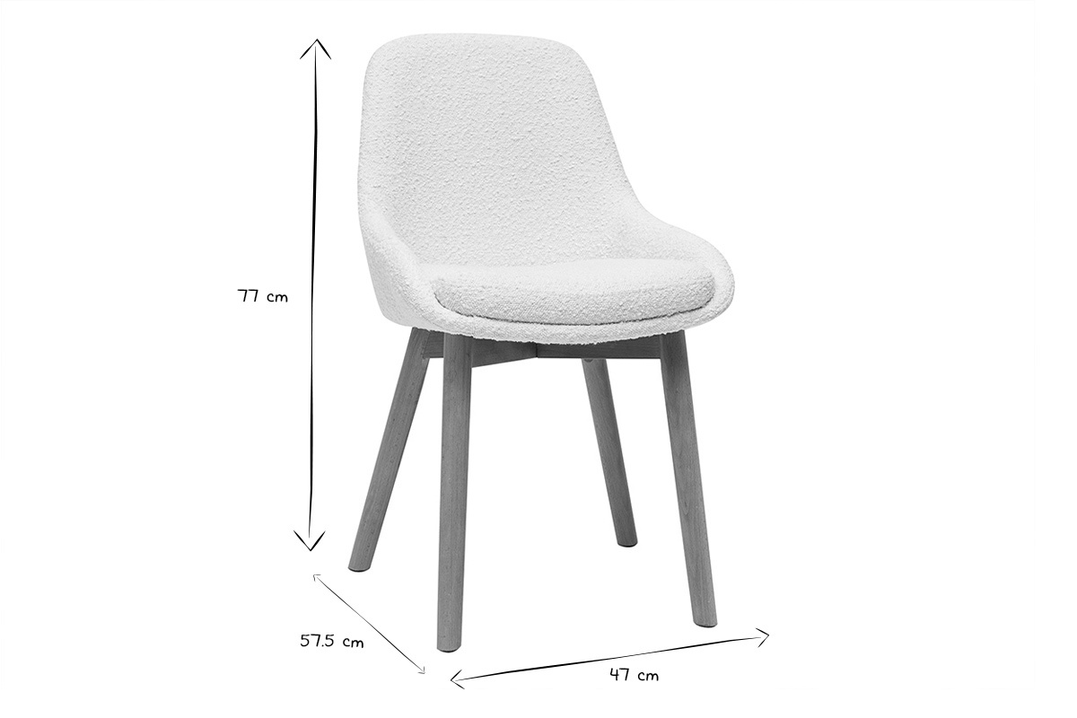 Zwischen zeitgenössischem Design und Authentizität vereinen diese Stühle aus weißem Bouclé-Wollstoff und hellbraunen Holzbeinen auf stilvolle Weise klare Linien und Authentizität. Ganz im skandinavischen Trend folgen die zeitlosen Silhouetten dieser skandinavischen Stühle ihrer eleganten Einfachheit in einer Küche oder einem Esszimmer, das nach Sanftheit und Funktionalität strebt.