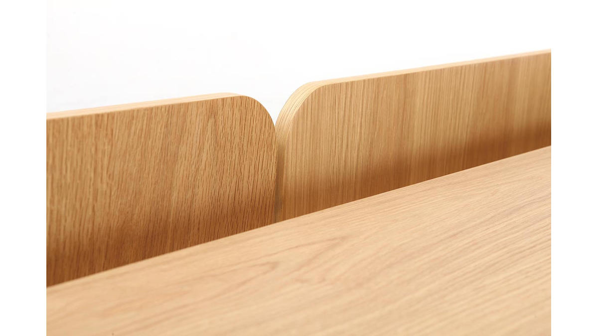 Der Schreibtisch JAPANSK wird aus Holzfaserplatten mit natürlichem Eichenfurnier aus Gummibaumholz hergestellt. Um den skandinavisch-japanischen Stil abzurunden und für die nötige Stabilität zu sorgen, wurde dem Gestell eine graue Traverse aus Metall hinzugefügt. Dieses Möbelstück überzeugt durch eine äußerst minimalistische Konzeption und vereint dennoch alle Vorzüge eines praktischen Schreibtisches.