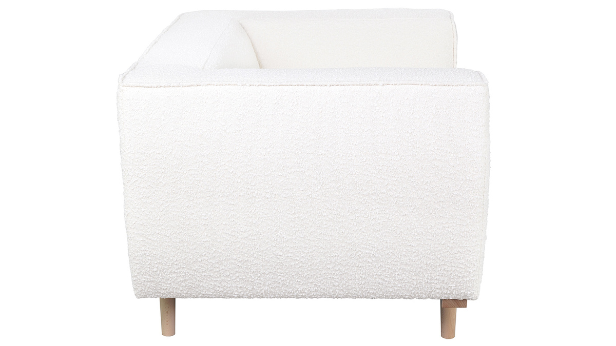 Mit seinem Bezug in der Wirkung von écrufarbener Bouclé-Wolle steht dieser Sessel im Zeichen des gemütlichen skandinavischen Looks. Dieser trendige Stoff wurde für den besonderen Effekt mit einem Holzgestell und delikaten Beinen aus massiver Buche kombiniert. Der Sessel MORRIS ist eine Mischung aus Geradlinigkeit und runden Formen und bietet eine elegante Sitzgelegenheit mit einem subtilen, entspannten Stil. Wahrlich eine Entspannungsoase, die zum Einkuscheln einlädt.