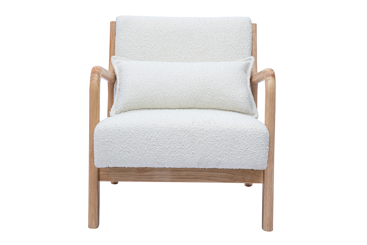 Die abgerundeten Kanten und die organischen Linien des Gestells im Vintage-Stil beherbergen eine gemütliche Sitzfläche, die mit einem weißen Stoff mit Bouclé-Wolleffekt bezogen ist. Dieser schlichte, zeitlose und helle Farbton passt hervorragend zu hellem Holz. Die authentische und warme Silhouette des Sessels DERRY vereint Eleganz und Schlichtheit und wird zweifellos in einem Schlafzimmer oder einem Wohnzimmer im skandinavischen Stil ihren Platz finden.