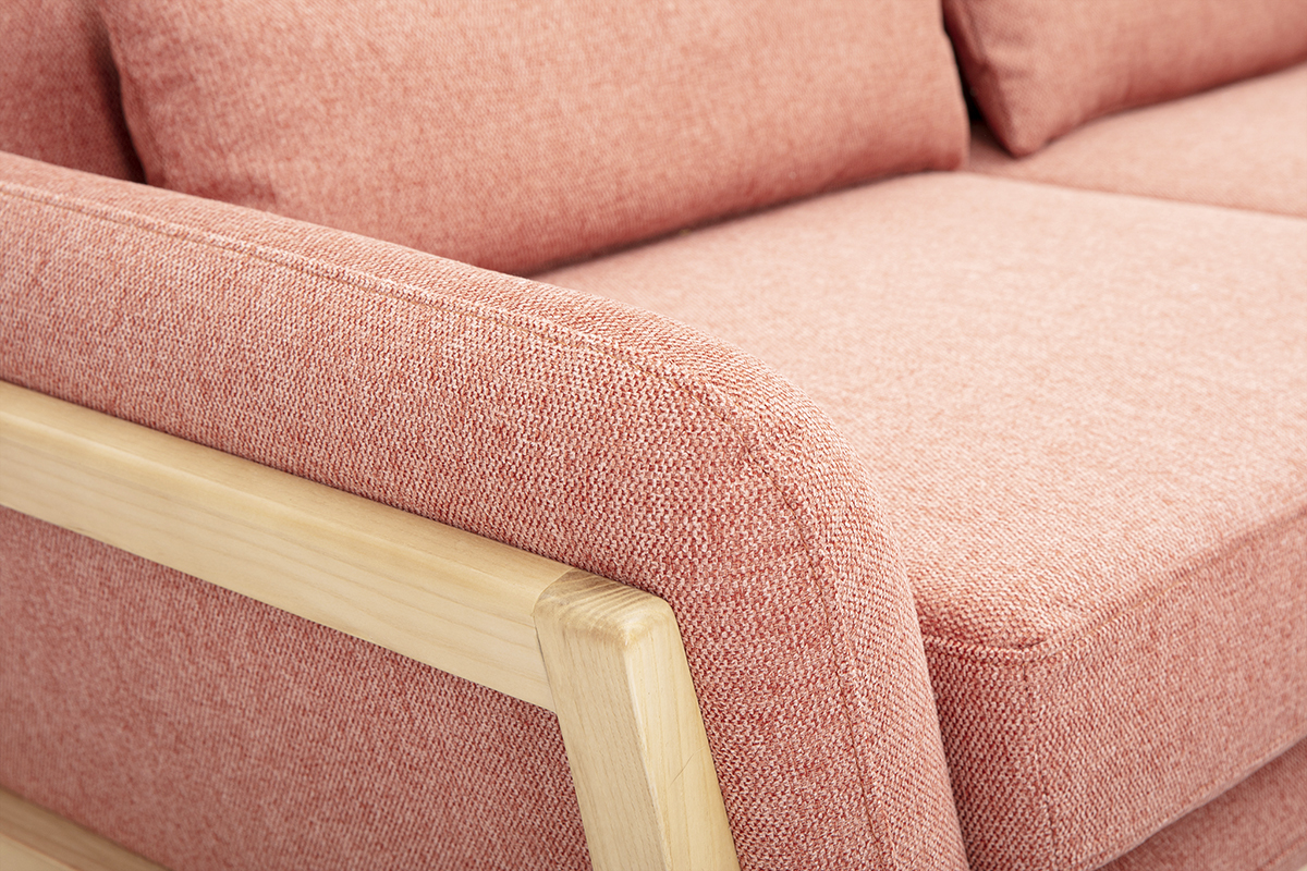 3-Sitzer-Sofa aus Terrakotta-Velourstoff und hellem Holz YOKO wird zerlegt geliefert. Einfache Montage, nur die Rückenlehne muss befestigt werden.