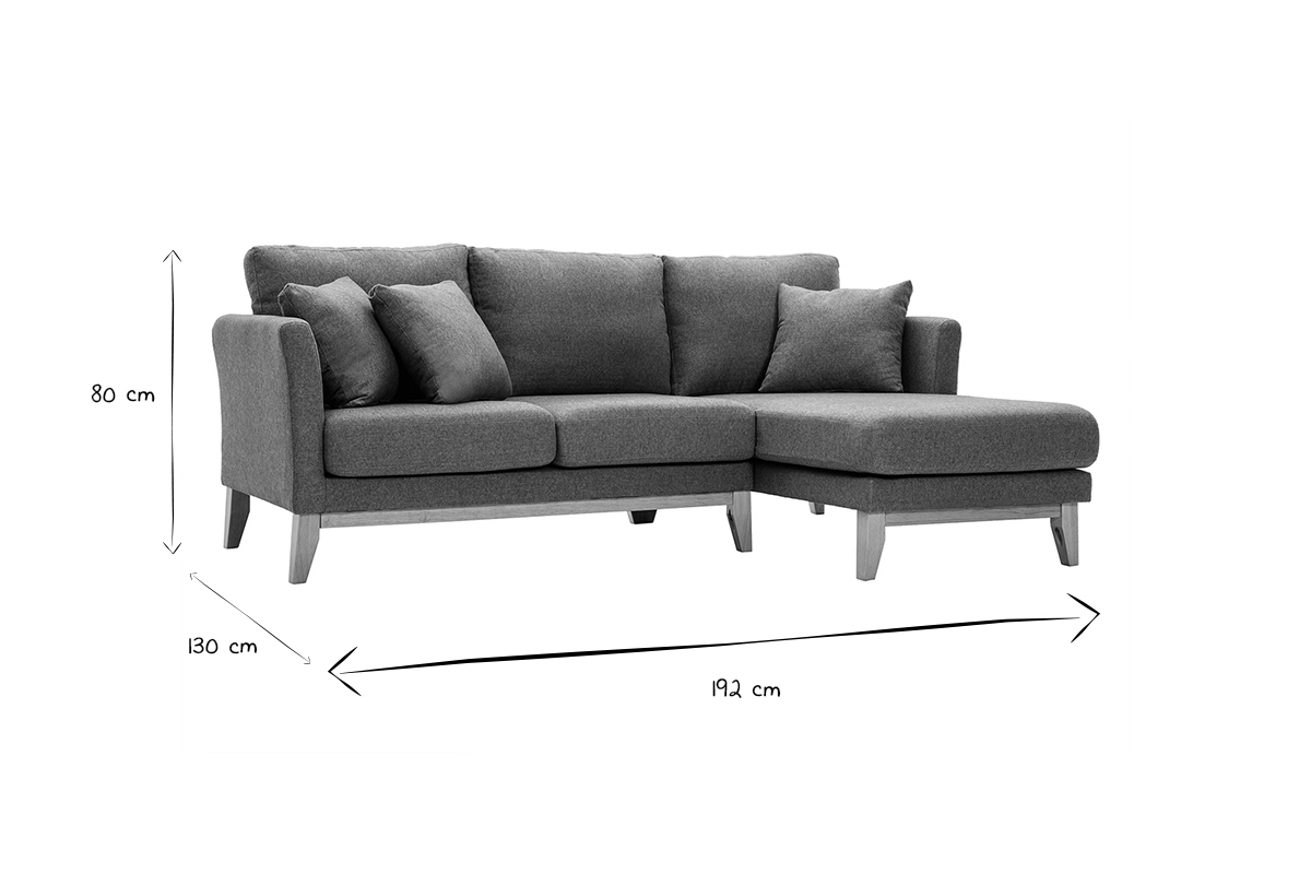 Skandinavisches Ecksofa rechts aus graugrünem Stoff mit abnehmbaren Bezügen und hellem Holz 4 Sitzer OSLO wird montagefertig geliefert. Einfache Montage: Nur die Beine müssen montiert werden. Da die Pakete sperrig sind, raten wir Ihnen zu prüfen, ob Türen und Treppen den Durchgang ermöglichen.