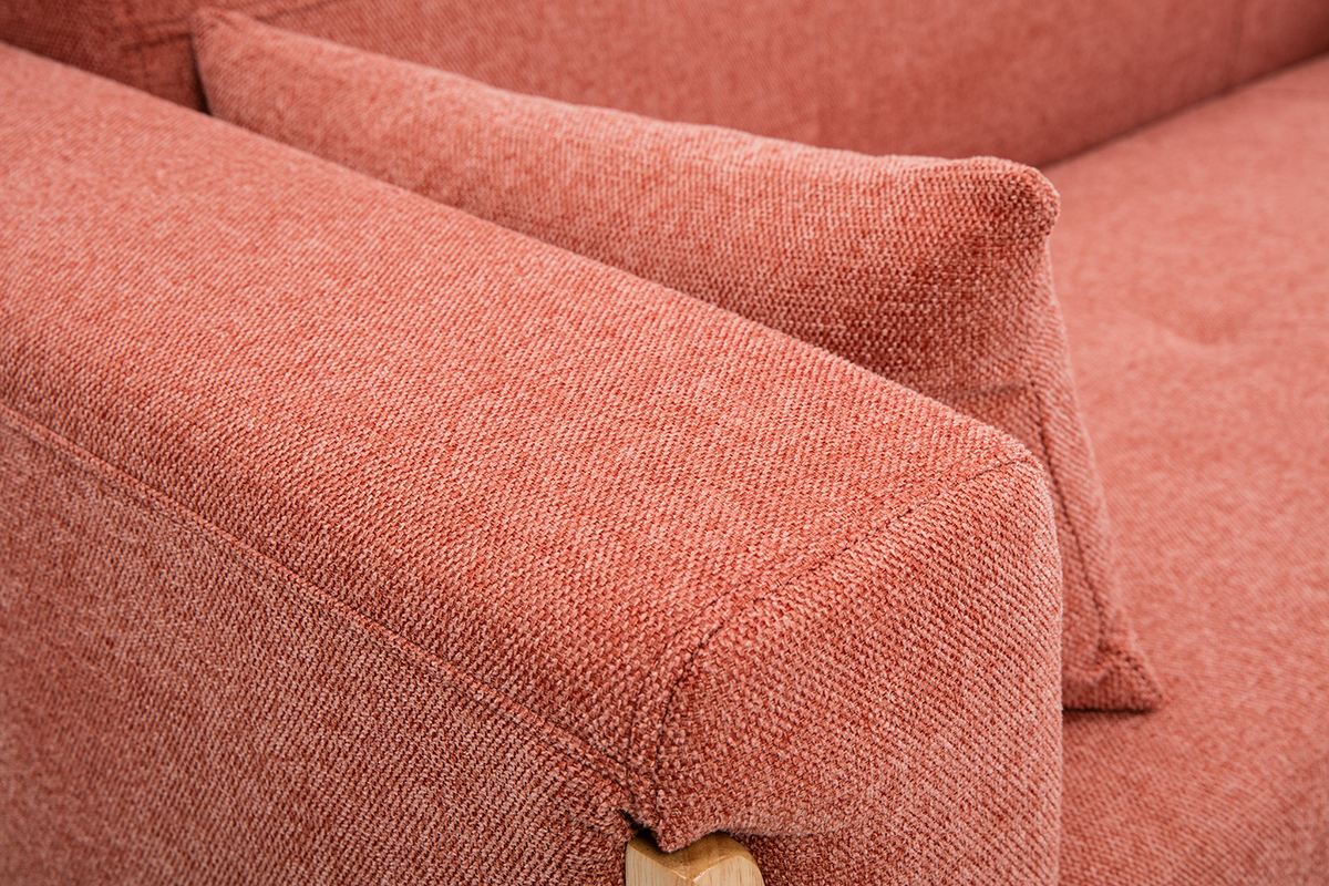 Als Kontrast zu den schönen blonden Farbreflexen des Holzes ist dieses kleine 2-Sitzer-Sofa mit einem wunderschönen terracottafarbenen Stoff mit gepolsterter Oberfläche ausgestattet. Dieser sanfte und unendlich trendige Bezug verleiht FJORD eine warme Ausstrahlung.