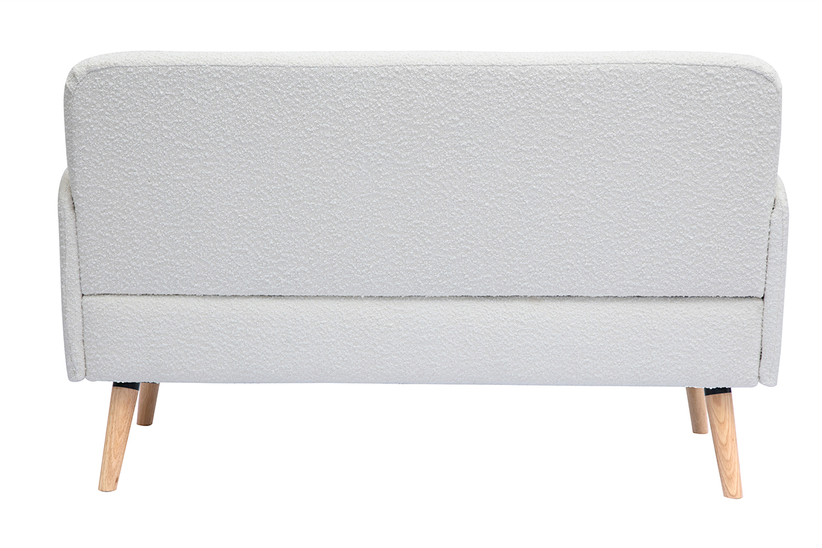 Sofa aus weißem Stoff mit Bouclé-Wolleffekt und hellem Holz wird montagefertig geliefert.