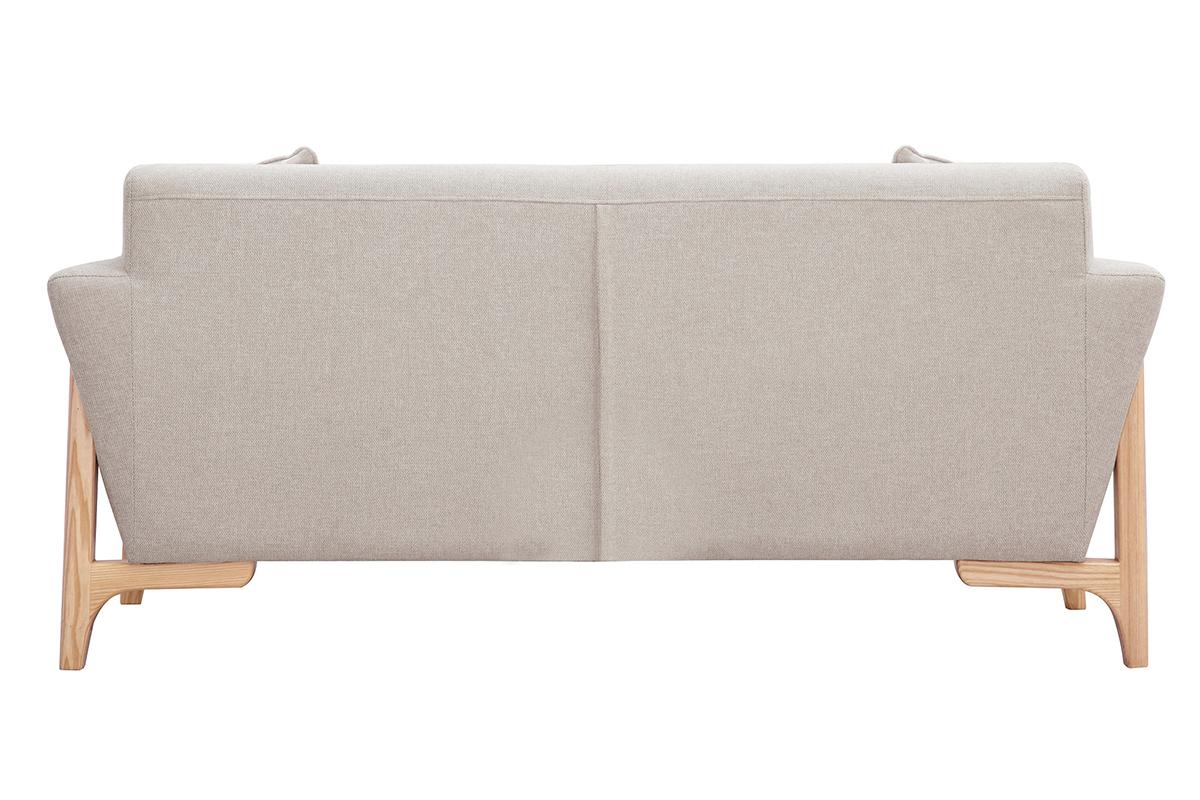Dieses schlichte und authentische Sofa zeichnet sich durch das einzigartige Design seines Gestells aus massiver Esche aus. Die Geradlinigkeit der Struktur unterstreicht die prallen Formen der Sitzfläche. Der beigefarbene Stoff mit Samteffekt sorgt im Duo mit dem hellen Holz für eine heimelige und helle Atmosphäre. Obwohl die zeitlose Silhouette dieses 2-Sitzer-Sofas zu vielen Einrichtungsstilen passt, kann man es sich mit seinem minimalistischen und kuscheligen Stil perfekt als Ergänzung zu einem Wohnzimmer im japanischen oder skandinavischen Look vorstellen.