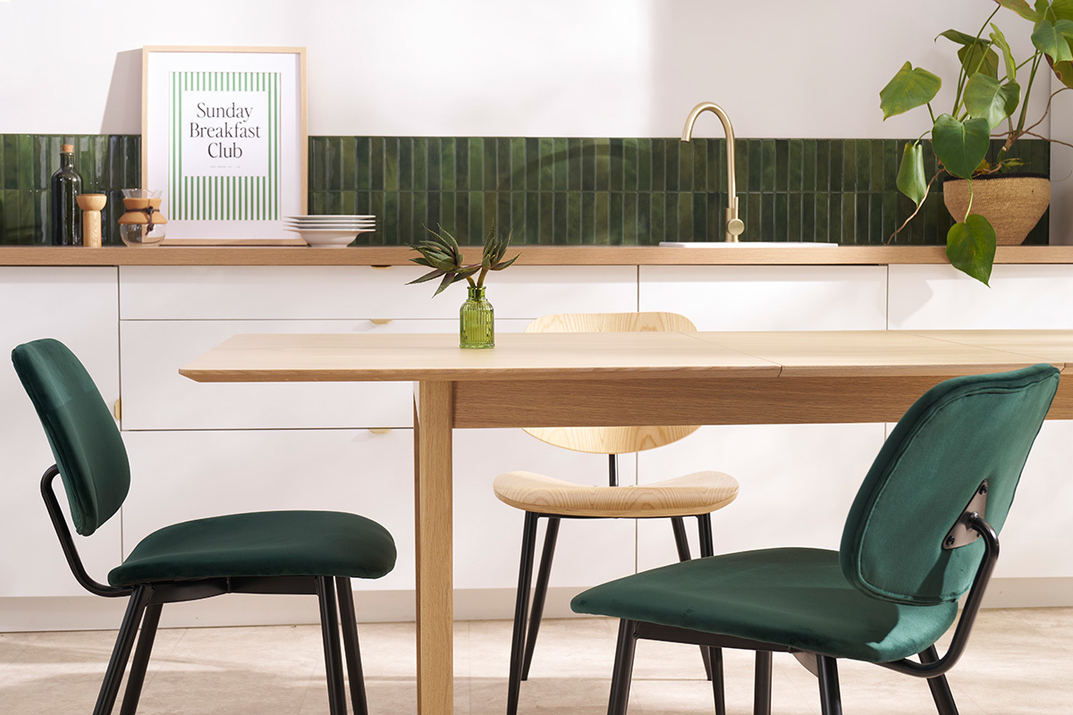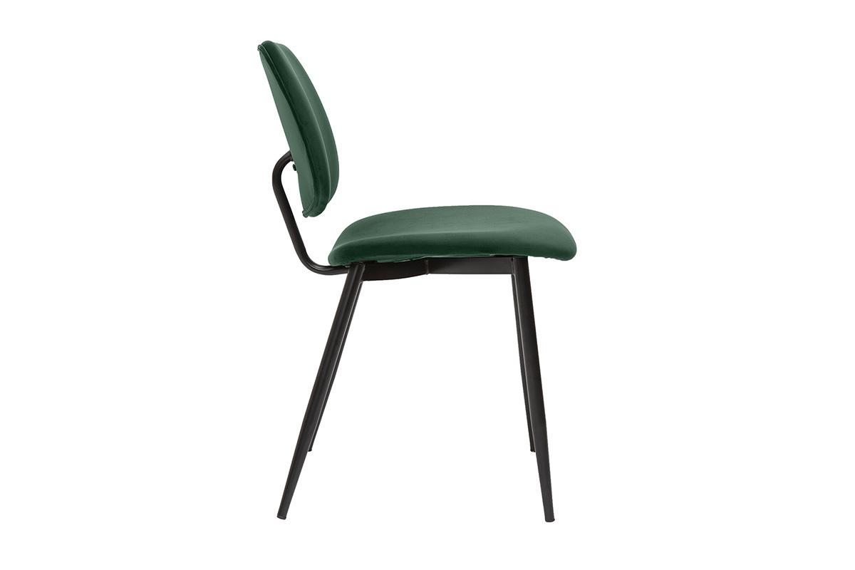 Mit ihrer schlanken Silhouette und den großzügigen Kurven bieten diese Stühle eine so schöne wie minimalistische Ästhetik. Mit Blick auf das Wesentliche wird hier für einen schicken und trendigen Look gesorgt. Diese Sitzmöbel aus grünem Samt und schwarz lackiertem Metall sehen elegant aus und werden in einem zeitgenössisch dekorierten Interieur optimal zur Geltung kommen. Die luftige Silhouette der Stühle TOBIAS verleiht dem Essbereich eine zarte und feine Note.