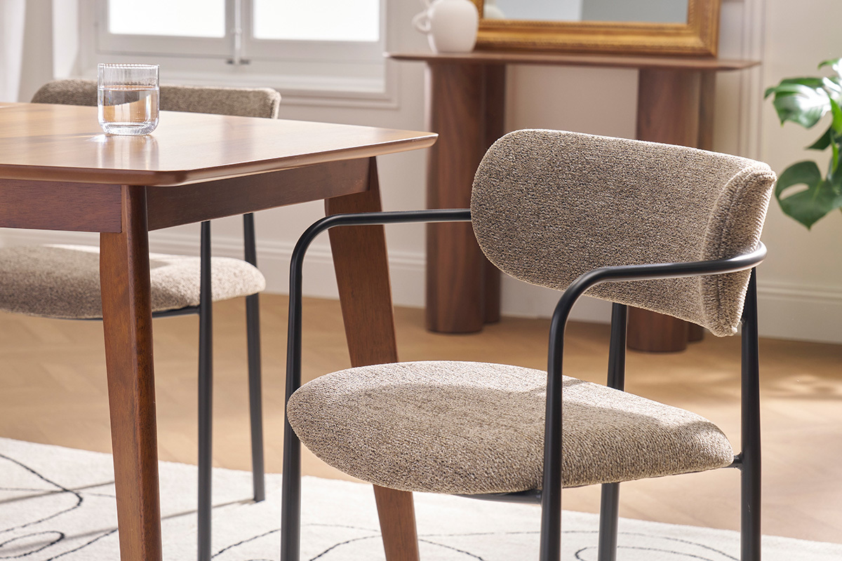Die Polsterung (24 kg/m3) von Sitzfläche und Rückenlehne bietet ausgezeichnete Unterstützung und eignet sich perfekt für Familienessen, gesellige Abende mit Freunden oder auch längere Arbeits- oder Lesemomente. Die zart geschwungenen Armlehnen verstärken diese Ergonomie und ermöglichen eine entspannte und natürliche Haltung.