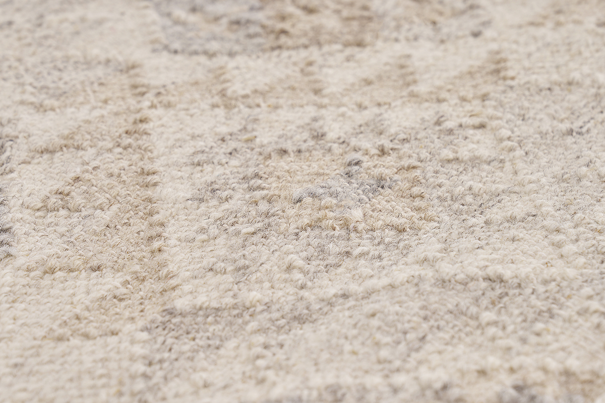 Dieser beige gemusterte Teppich steht für einen trendigen und natürlichen Dekorationsansatz, der Wolle und Baumwolle mit einem zeitlosen Design kombiniert. Perfekt, um dem Boden Struktur und Wärme zu verleihen, wird er trotz seiner zurückhaltenden Größe ein zentrales Dekorationselement sein.