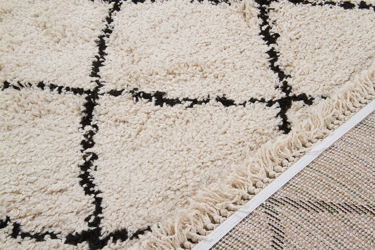Die schwarzen Rauten auf dem écrufarbenen Hintergrund und der Fransenfinish sind ein Echo der orientalisch inspirierten Berberteppiche. Der Teppich ZELIA mit der spannenden Textur und dem groben Stil passt in einen Wohnbereich mit ethnischem Ambiente oder Bohemian-Chic.