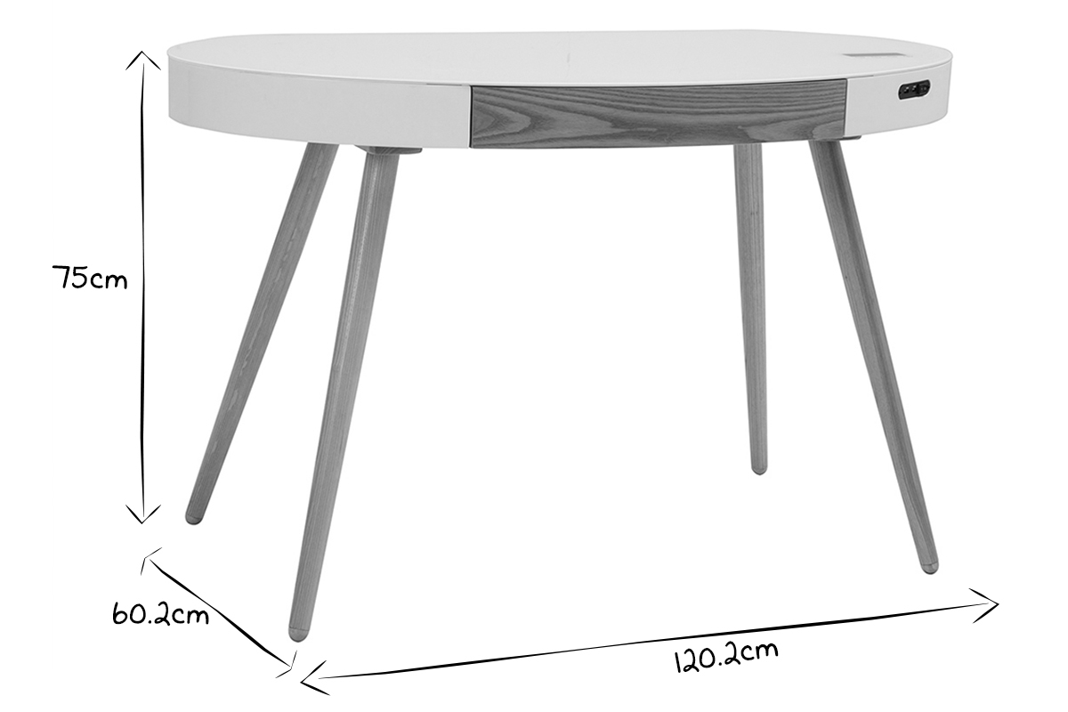 Dieser weiße Schreibtisch aus hellem Holz verfügt über zwei USB-Anschlüsse, mit denen Sie Ihre verschiedenen Geräte aufladen können. Dieser mit Bluetooth ausgestattete Schreibtisch ermöglicht das Streamen von Audio von Tablet, Computer oder Smartphone. Die integrierten Lautsprecher mit einstellbarer Lautstärke bieten einen Klang von bemerkenswerter Klarheit, der über das hinausgeht, was ein Computer in Bezug auf Klangqualität bietet. Das Touch-Interface, direkt in die Tischplatte eingebettet, ermöglicht es Ihnen, die Lautstärke zu erhöhen oder zu senken, zum nächsten Titel zu wechseln oder die Wiedergabe anzuhalten.