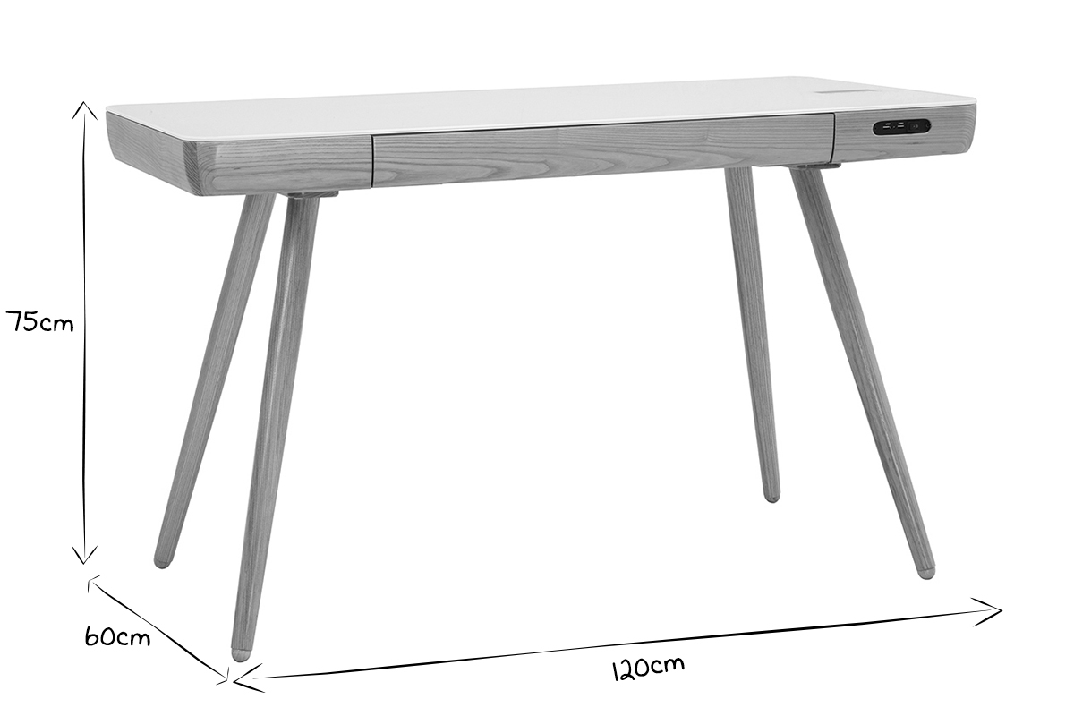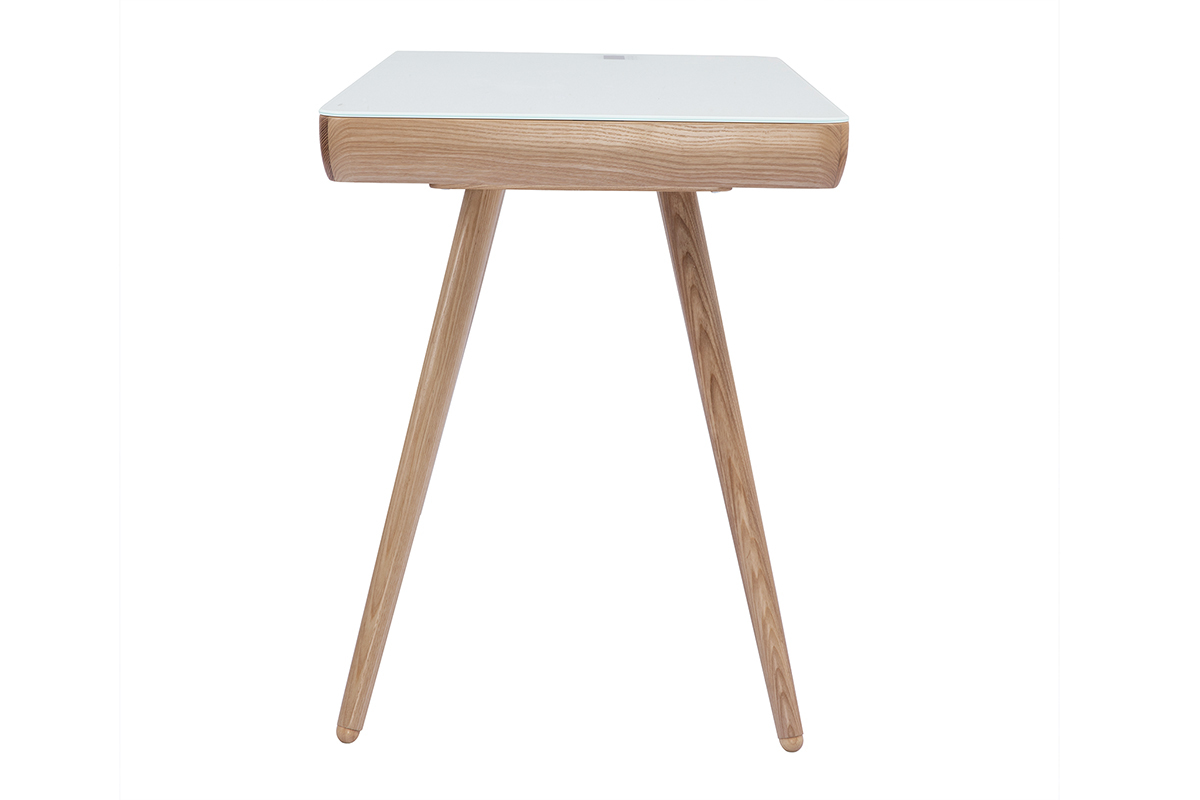 Die Tischplatte besteht aus weiß getöntem Glas wobei die Beine und das Gestell aus Eschenholz bestehen für ein natürliches Design. Eine breite Schublade ermöglicht Ihnen die Unterbringung Ihrer Arbeitsutensilien. Der vernetzte Multimedia-Schreibtisch - weißes Glas und helles Holz CLEVER ist ebenfalls in den Varianten Weißes Metall mit transparenter Platte oder mit schwarz getöntem Glas erhältlich.