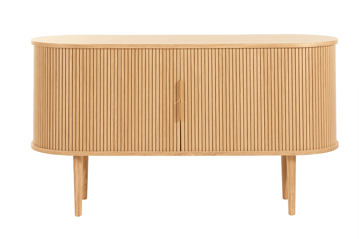 Getragen von einem soliden Gestell aus massiver Eiche, besteht der robuste Korpus aus Holzfaserplatten mit Eichenfurnier aus sechs praktischen Fächern. Die vier zentrale Nischen (B48,1 x T36,6 x H21,3 cm) und die zwei konvexe Seitennischen (R22,5 x T36,6 x H48 cm) eignen sich hervorragend, um Geschirr, Haushaltswäsche, Unterlagen oder Bücher unterzubringen.