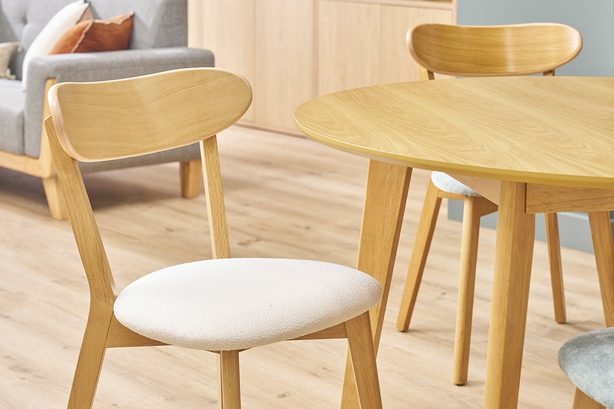 Hergestellt aus Furnierplatte im Eichen-Look, so bieten diese platzsparenden Stühle mit den Maßen L44 x T56 x H82 cm sowohl Leichtigkeit als auch Strapazierfähigkeit. Sie lassen sich im Handumdrehen vom Wohnzimmer auf den Balkon bringen, für die Pflege genügt ein feuchtes Tuch. Die gewölbte Rückenlehne und die gepolsterte Sitzfläche (Schaumdichte 35 Kg/m³) garantieren den langlebigen Komfort im Alltag. Der Bezug der Sitzfläche aus weißem Stoff mit Bouclé-Wolleffekt (100 % Polyester) kontrastiert wunderbar mit der hellen Holznote. Die auf dem Eichenfurnier aufgetragene durchsichtige Lackierung nährt und schützt das Holz.